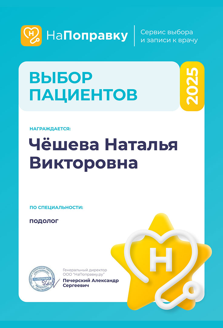 Входит в ТОП-10 подологов Санкт-Петербурга по версии портала НаПоправку.